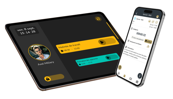 Elle permet aux employés de badger leur entrée et leur sortie avec l'application mobile ou notre appareil physique Sunkhronos Timeclock.